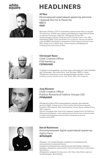 Сегодня креативный маркетинг становится ключевым фактором конкурентной борьбы в коммуникационных стратегиях брендов по всему миру. Инновационные и высокотехнологичные производства меняют быт и потребительский спрос с невероятной скоростью, требуя новых актуальных маркетинговых инструментов и решений. В насыщенной информационной среде все чаще побеждают эмоции и популизм, и порой даже профессионалам трудно отличить инновации и действительно работающие инструменты маркетинга от фейков, которыми перенасыщен интернет. В этом году «Белый Квадрат» представит программу, максимально актуализированную эффективными маркетинговыми практиками, работающими на рынках Европы и СНГ, пригласив в качестве хедлайнеров программы их разработчиков.