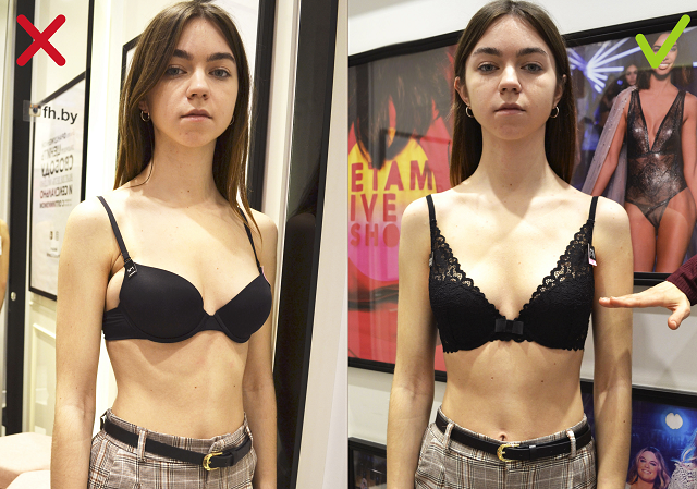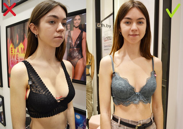 Этим грешат многие девушки. Наша героиня, например, была уверена, что у нее размер 75 B, но в процессе примерок оказалось, что, на самом деле, ее размер 70 С. Если вы подобрали слишком маленькую чашку, грудь будет вываливаться из нее, образуя «эффект 4 груди», а если чашка слишком большая – грудь не заполнит весь ее объем, и при наклоне есть риск выставить грудь на всеобщее обозрение. «Эффект 4 груди» грозит не только дискомфортом, но и опасен тем, что нарушает приток крови и лимфы, что может негативно сказываться на здоровье.