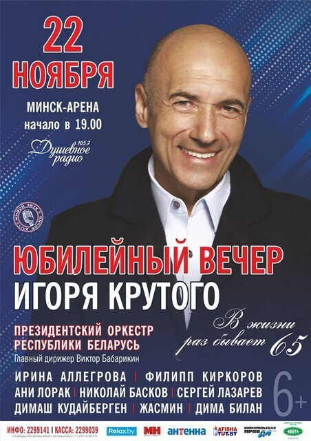 22 ноября, в Минск-Арена выступят самые яркие и популярные исполнители: Ирина Аллегрова, Филипп Киркоров, Ани Лорак, Николай Басков, Димаш Кудайберген, Жасмин, Сергей Лазарев, Дима Билан и, конечно же, Игорь Крутой.