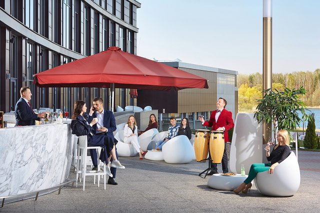 М ТЕРРАСА, или Место Магической Музыки – имя нового проекта в Minsk Marriott. В разгар лета, в июле мы открыли сезон музыкальных вечеров 2019 года на большой речной террасе с фонтанами. На фоне разноцветных огней всё оживет с ритмами музыки: классический джаз, современные биты и DJ. В меню представлены хиты команды поваров под управлением Антона Каленика (тапасы, бургеры, пицца, суши) и широкий летний бар.