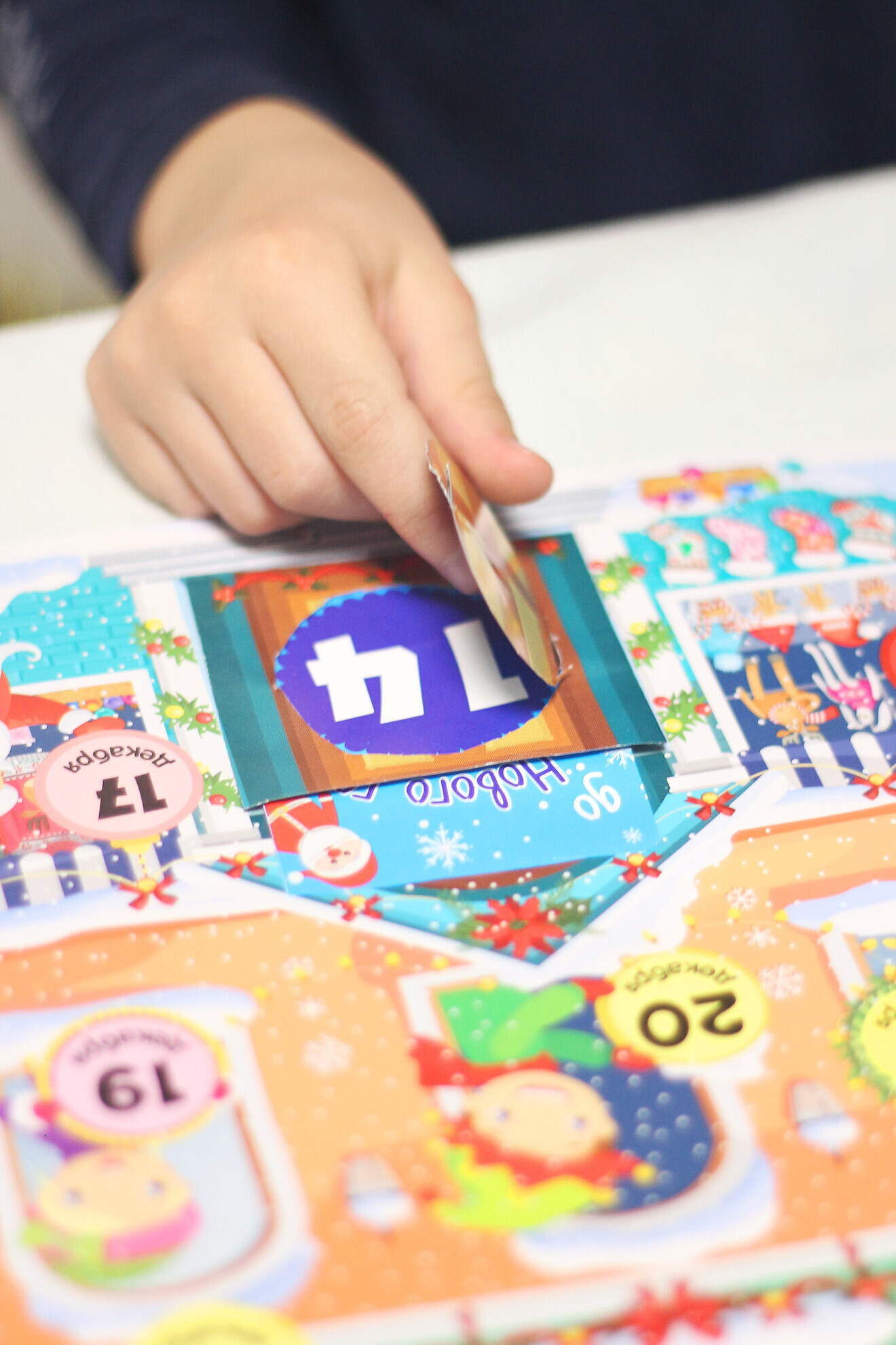 Перед вами книга-игра с плакатом-календарем и красочными игровыми карточками. Каждый день ребенок будет выполнять задание на обороте карточки и приклеивать наклейку-шарик на плакат. Все, что вам нужно, — собрать плакат, вырезать карточки и поместить в кармашек на внизу. На карточке ребенок постарше сможет прочитать количество дней до Нового года. А малыши будут ориентироваться по пустым шарикам на плакате.