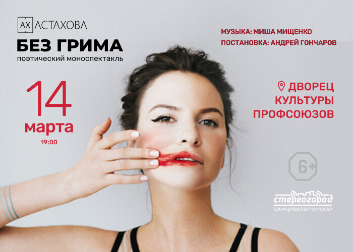 Новое представление Ах Астаховой — это выход за рамки привычного формата презентации стихов "человек и микрофон". Зритель буквально окажется внутри текста, смысла, сути лирики Астаховой. Читая свои тонкие трогательные произведения, автор хочет, чтобы зритель побывал в тех же местах и пережил те моменты, которые вдохновили ее на создание своих текстов. Постановка "Без грима" - это откровенный разговор на тему любви, одиночества, близости и принятии себя.