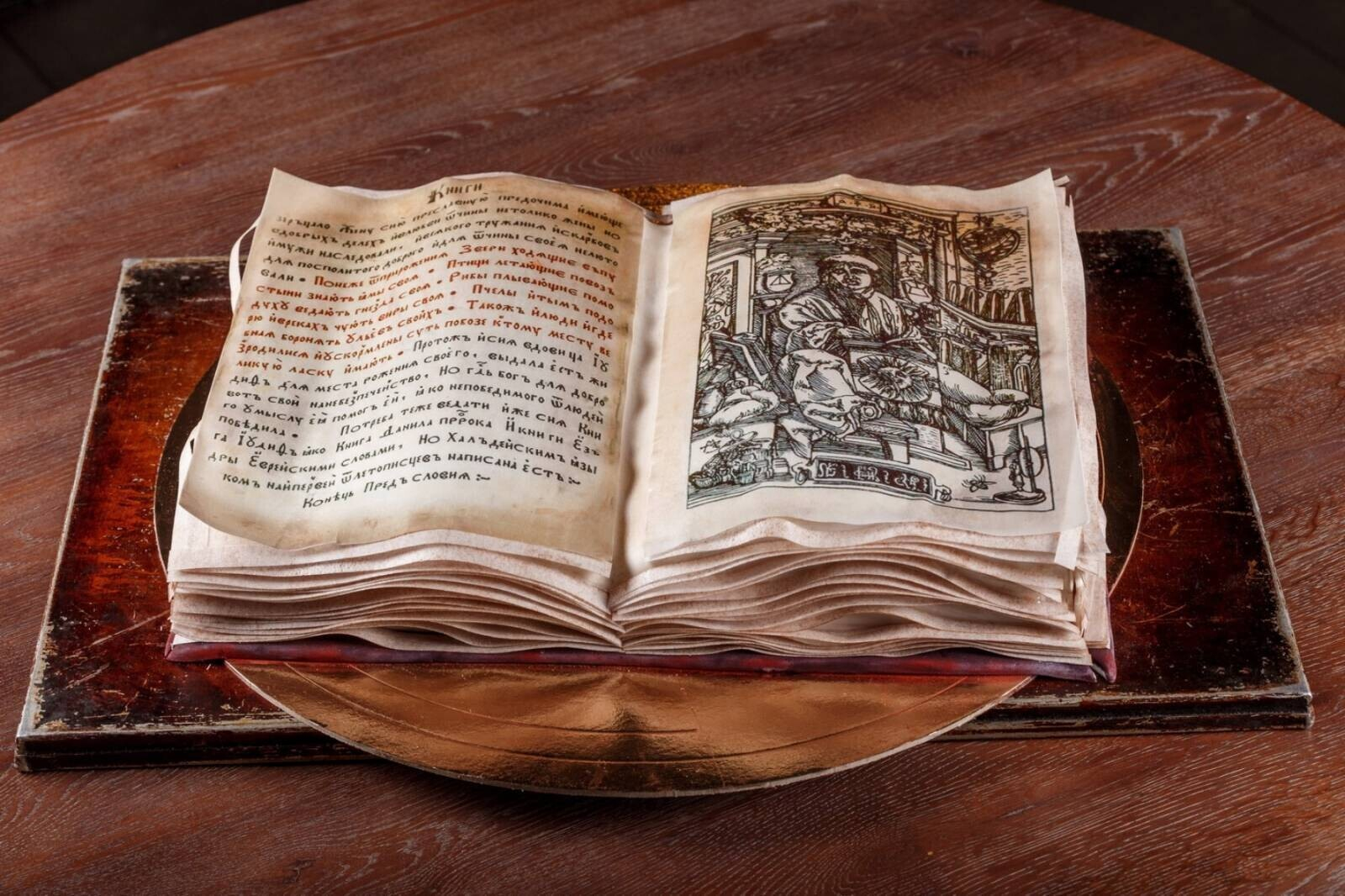 Торт полностью съедобен. Страницы книги созданы из рисовой бумаги. Внутри – домашний Наполеон с апельсиновыми цукатами.
