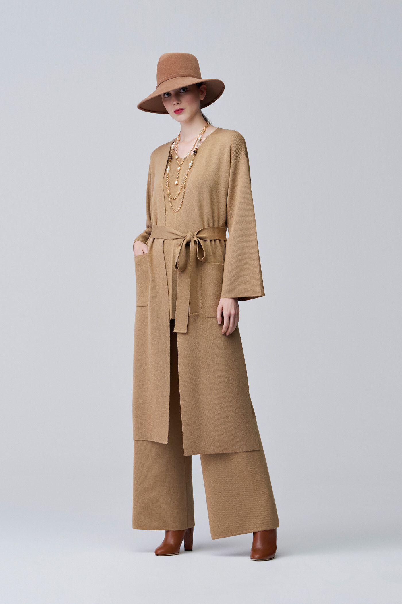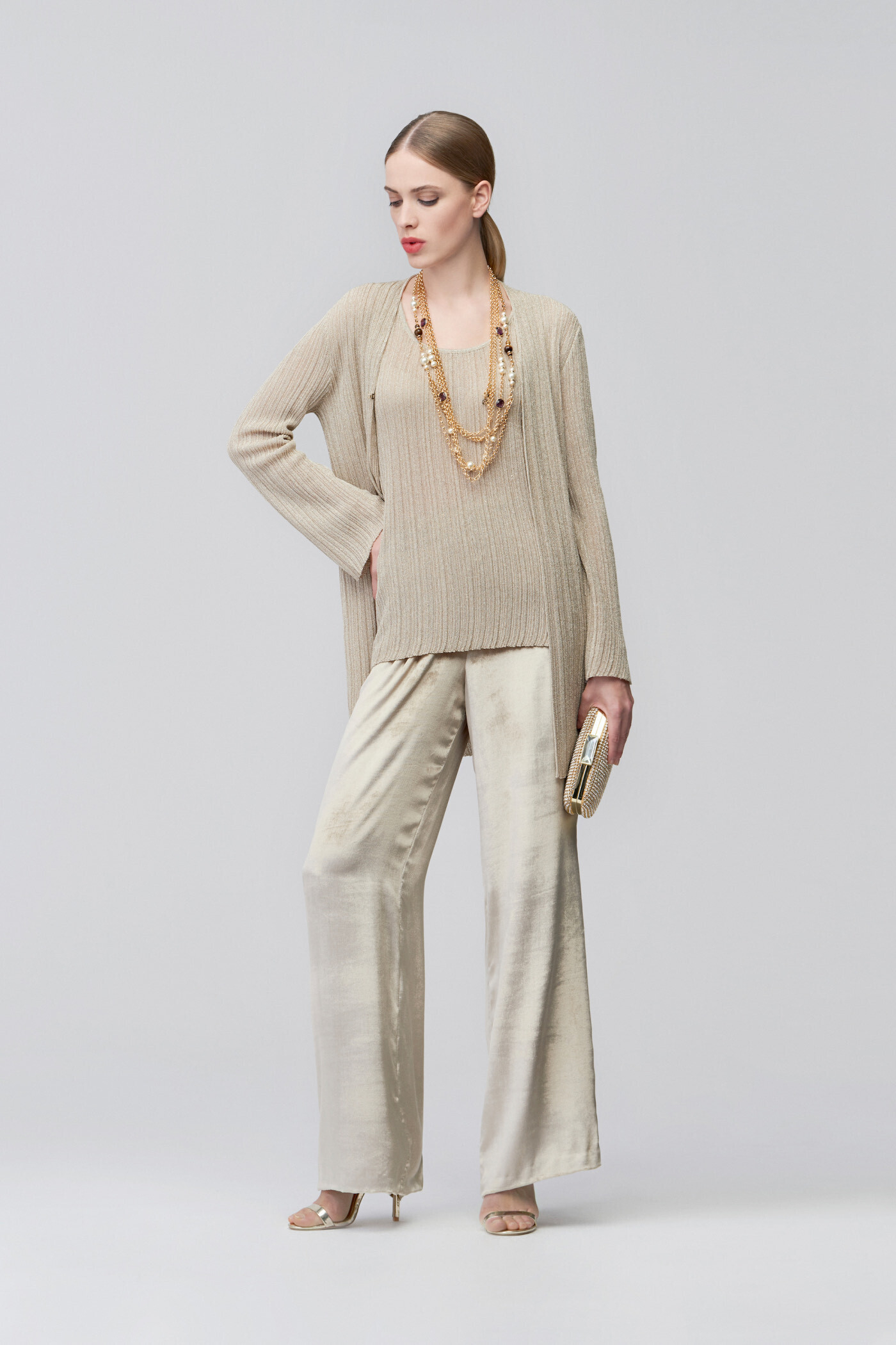 Трикотаж, отличительный элемент бренда, является бесспорным игроком в этой осенне-зимней коллекции, посвященной истории компании. Примерами могут быть пуловеры из мягкой ангорской шерсти и макси-кардиганы со вставками и узорами из люрекса, которые можно носить также как мини-платье.