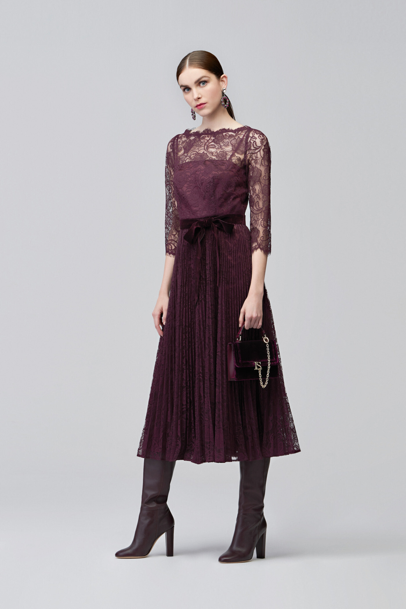 Роскошное сочетание гипюра с бархатом гармонично сочетается в элегантном платье длины миди с контрастной подложкой.