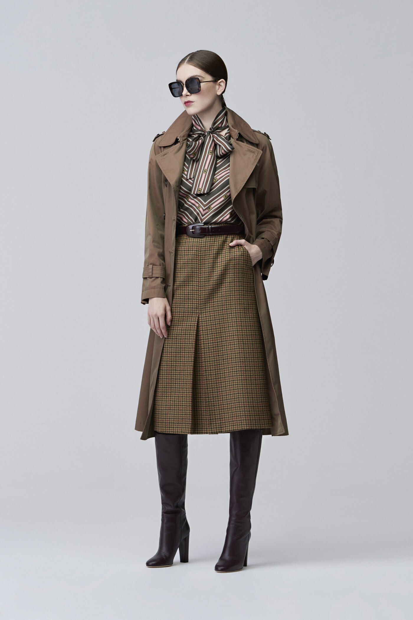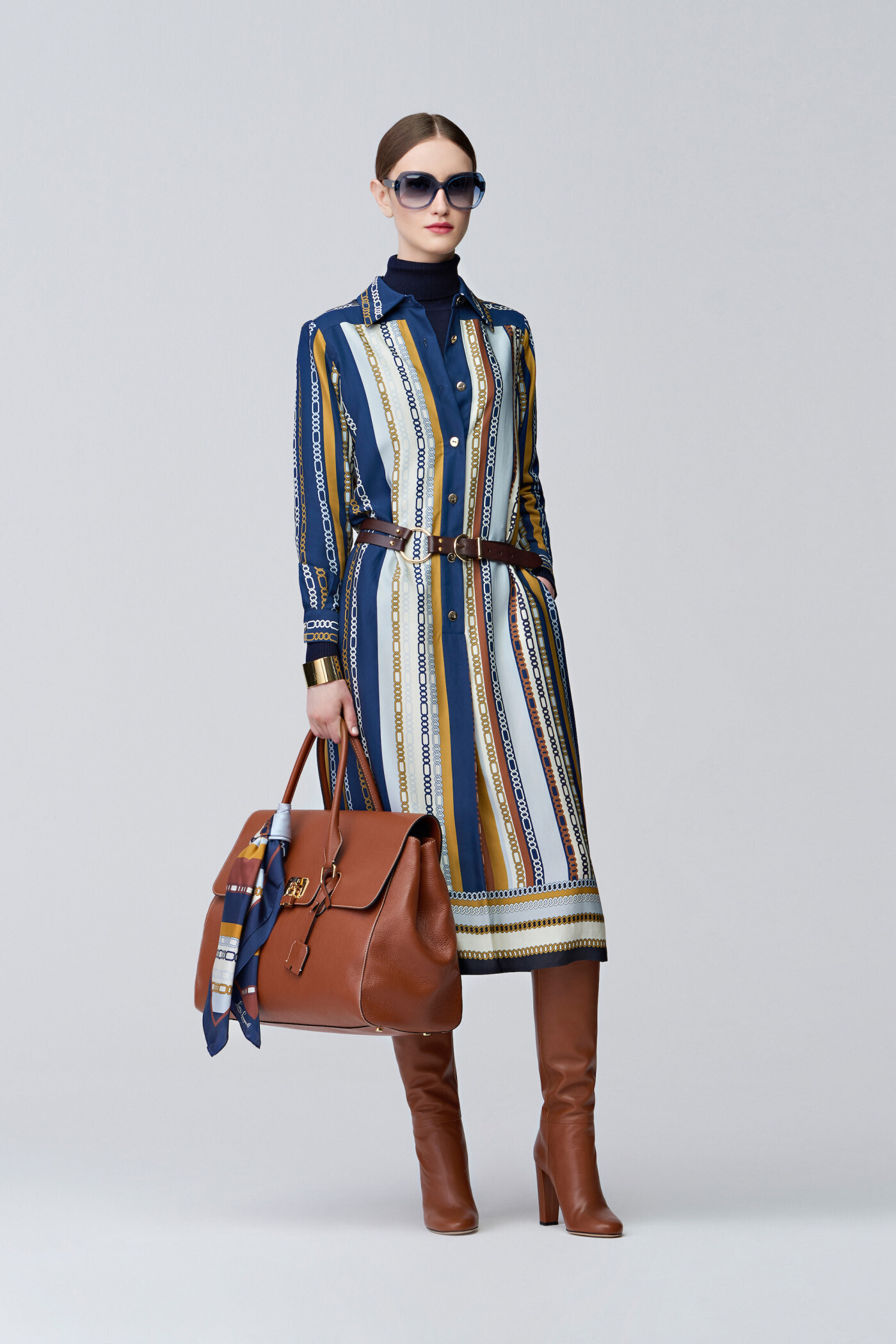 Еще одна повторяющаяся тема коллекции — кожа, представленная в брюках мужского кроя с вытачками в сочетании с рубашкой и платком в виде галстука, в дополнение образа двубортное пальто шафранового цвета. Для того, чтобы создать более городской и изысканный образ, можно подобрать наряд из табачной кожи с курткой-сафари поверх ультратонкой юбки.