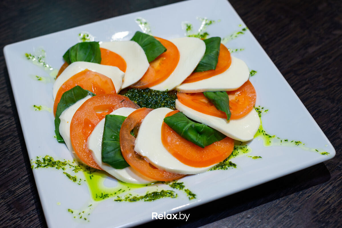 Закуска «Капрезе» (245) — 10 руб. (Сыр Моцарелла, томаты свежие, салат листовой, базилик, песто из рукколы)