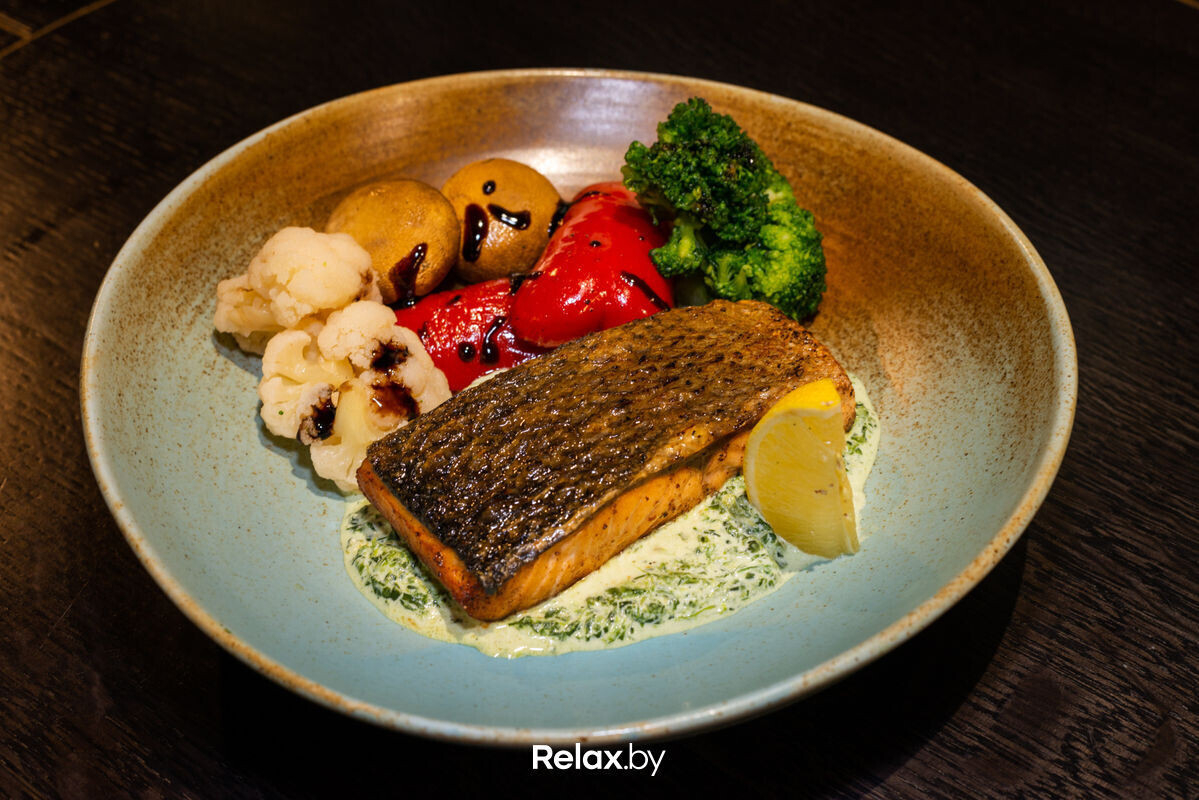 Семга с овощами в сливочно-шпинатном соусе (100/80/150) — 20 руб. (Филе семги, вино красное сухое, капуста цветная, капуста брокколи, шампиньоны, перец сладкий свежий, соус соевый, соус шпинатный, салат листовой, лимон)