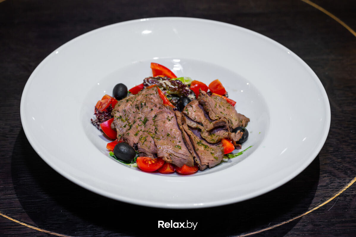 С ростбифом и ореховой заправкой (190) — 12 руб. (Говяжья вырезка, салатный микс, помидоры свежие, перец сладкий печеный, маслины б/к, заправка орехово-бальзамическая, зелень)