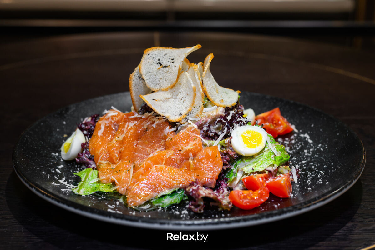 Салат Цезарь с лососем (190) — 13 руб. (Салат листовой, филе лосося, помидоры свежие, яйцо перепелиное, гренки, сыр Пармезан, заправка Цезарь)