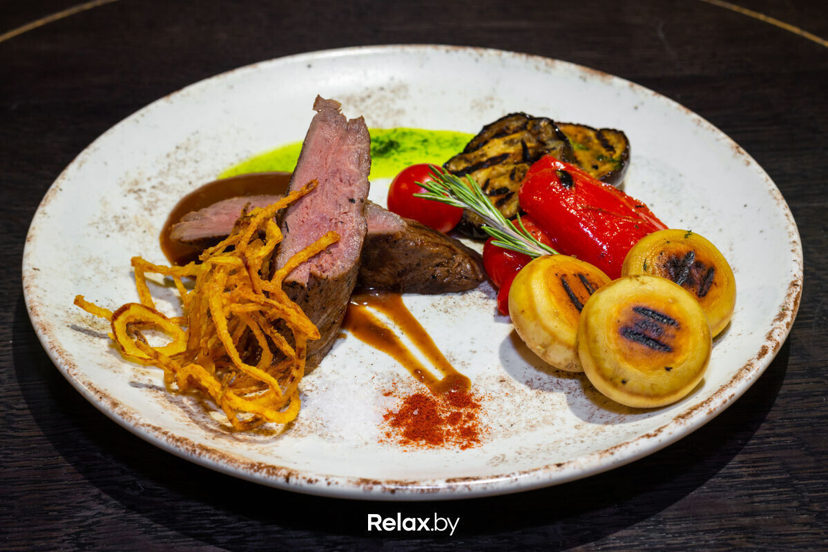 Медальоны из говядины с соусом Деми Гласс и овощами на гриле (150/50/150) — 19 руб. (Говяжья вырезка, баклажаны, перцы, шампиньоны, вино красное сухое, соус Деми Гласс, глазурь бальзамическая, соевый соус, перец черный молотый)