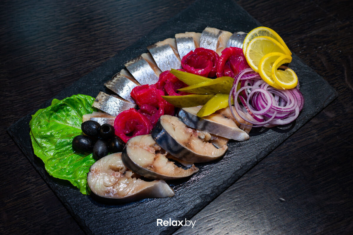 Закуска «Матье» (320) — 16 руб. (Сельдь филе, лосось Гравлакс сл/сол, скумбрия сл/сол, огурец консервированный, лук красный маринованный, салат листовой)