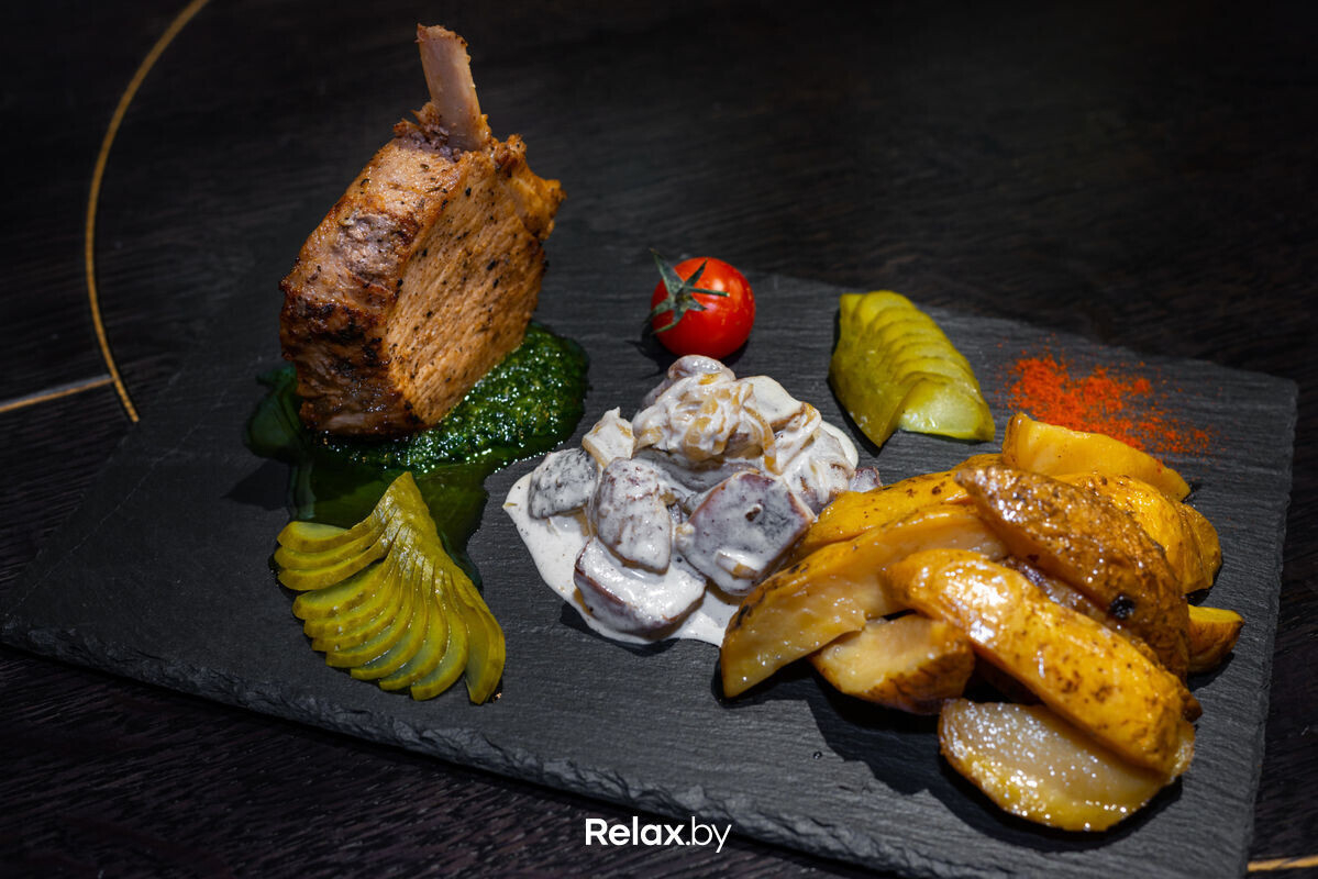 Эскалоп из свинины с картофелем конфи и жюльеном из белых грибов (150/80/150) — 19 руб. (Филе свиное, картофельные дольки, лук репчатый, огурец консервинрованный, белые грибы, маслины б/к, сметана, черный перец молотый)
