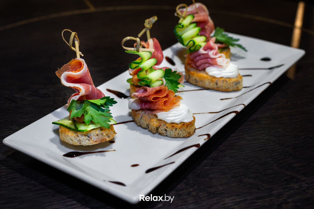 Канапе с прошутто (100/5шт) — 10 руб. (Хлеб, окорок, огурец свежий)