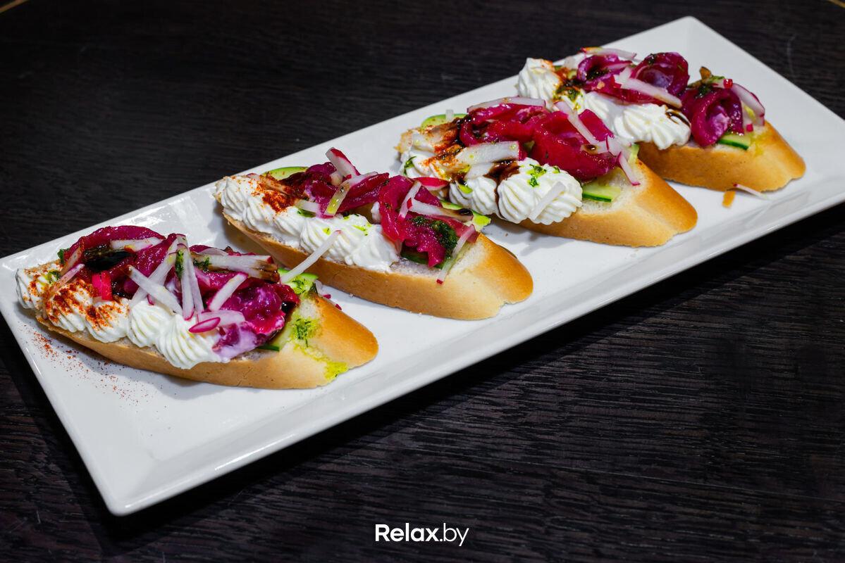 Брускетта с сыром, гравлаксом из лосося и домашним хлебом (260) — 13 руб. (Хлеб домашний, филе семги сл/сол, сыр Креметте, огурец свежий, зелень)