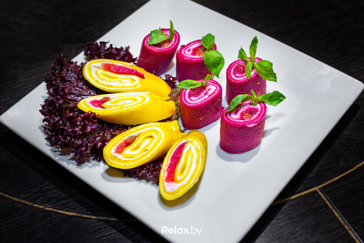 Блинчики с лососем (310) — 14 руб. (Блины, филе семги сл/сол, сыр Креметте, салат листовой, зелень)