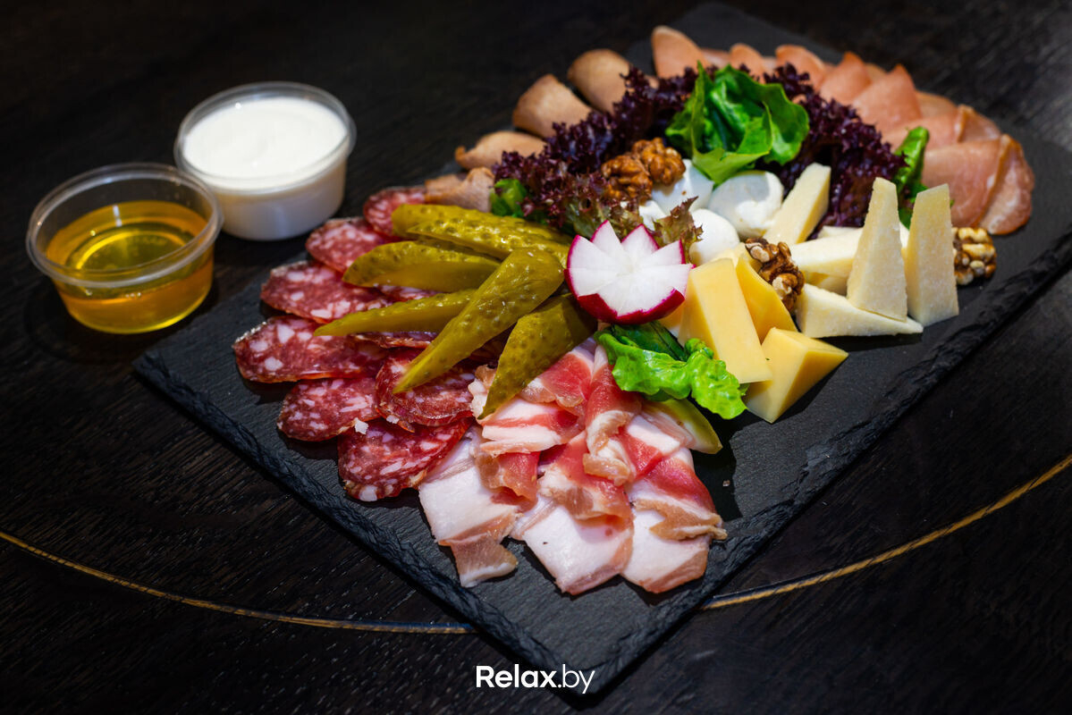 Плато мясо+сыр (390) — 24 руб. (Сыр Голландский, сыр Моцарелла, сыр Пармезан, грудинка соленая, язык отварной, полендвица с/к, колбаса с/к, огурец консервированный, мед, грецкий орех, салат листовой, соус хрен/сметана)