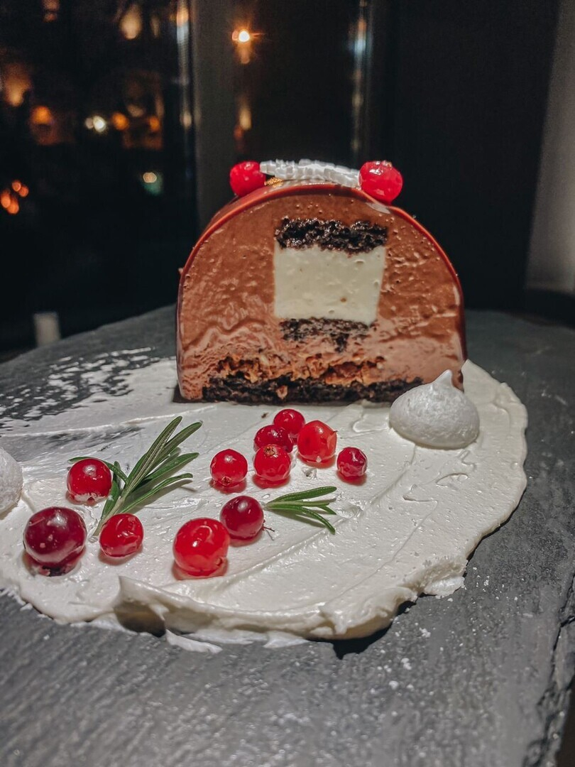 Самое популярный десерт — Рождественское полено! Нежный мусс из тёмного шоколада со сливочной панна коттой, пралине из миндаля и фундука — лакомство, которое несомненно заслуживает украсить праздничный стол.