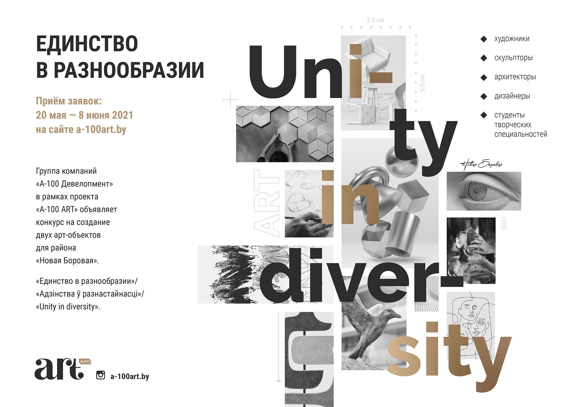 Конкурс на лучшие идеи проводит застройщик «А-100 Девелопмент» в рамках проекта «А-100 ART», инициированного компанией для поддержки и развития современного беларусского искусства. Подать заявку могут профессиональные художники, скульпторы, архитекторы, дизайнеры и студенты творческих специальностей. Допускается индивидуальное и коллективное участие.