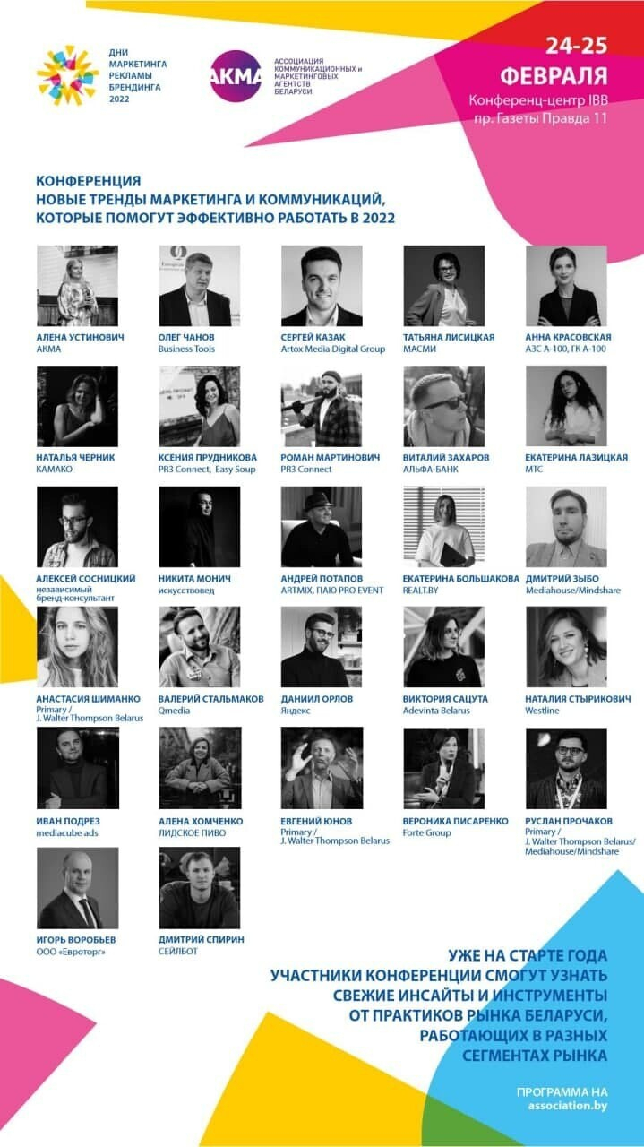 Всего 9 дней осталось до старта конференции Дни Маркетинга, Рекламы и Брендинга, которая пройдет 24-25 февраля в Минске. Событие в очередной раз станет яркой коммуникационной платформой для маркетологов, представителей бизнес-среды и индустрии коммуникаций. В программе конференции более 20 мастер-классов на темы, которые актуальны для тех, кто стремится быть эффективным в современном информационно-технологичном мире.