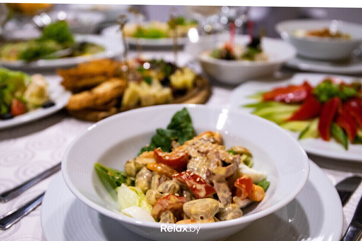 Разнообразит вечер живая музыка, медийный ведущий с конкурсами и подарками. Угощать будут салатом оливье с телячьим языком и креветками, свиным окороком, пирогом с курицей и грибами, люля-кебабом, а на десерт — восхитительный фондан.