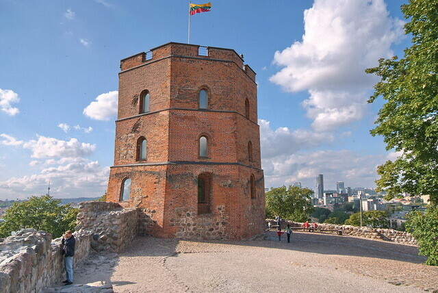 Будучи в Вильнюсе, просто нельзя не подняться на Замковый холм. И удобнее всего к нему пройти именно от Кафедральной площади. В свое время холм впечатлял мощными укреплениями, однако сейчас на этом месте остались лишь развалины замка и та самая башня Гедимина. Башня была построена в Средневековье из камня и бута, в ней три яруса, а на самой вершине есть смотровая площадка с потрясающим видом на Вильнюс.