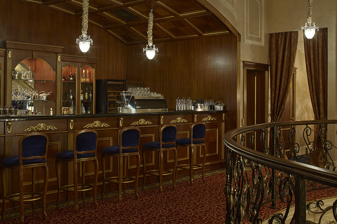 В интерьере заведения акцент сделан на роскошь и атмосферу королевского Ренессанса, которую создают лепнина, позолота, натуральный хрусталь и дорогие ткани. В качестве основных цветов оформления были выбраны благородный бежево-коричневый и богатый красный.