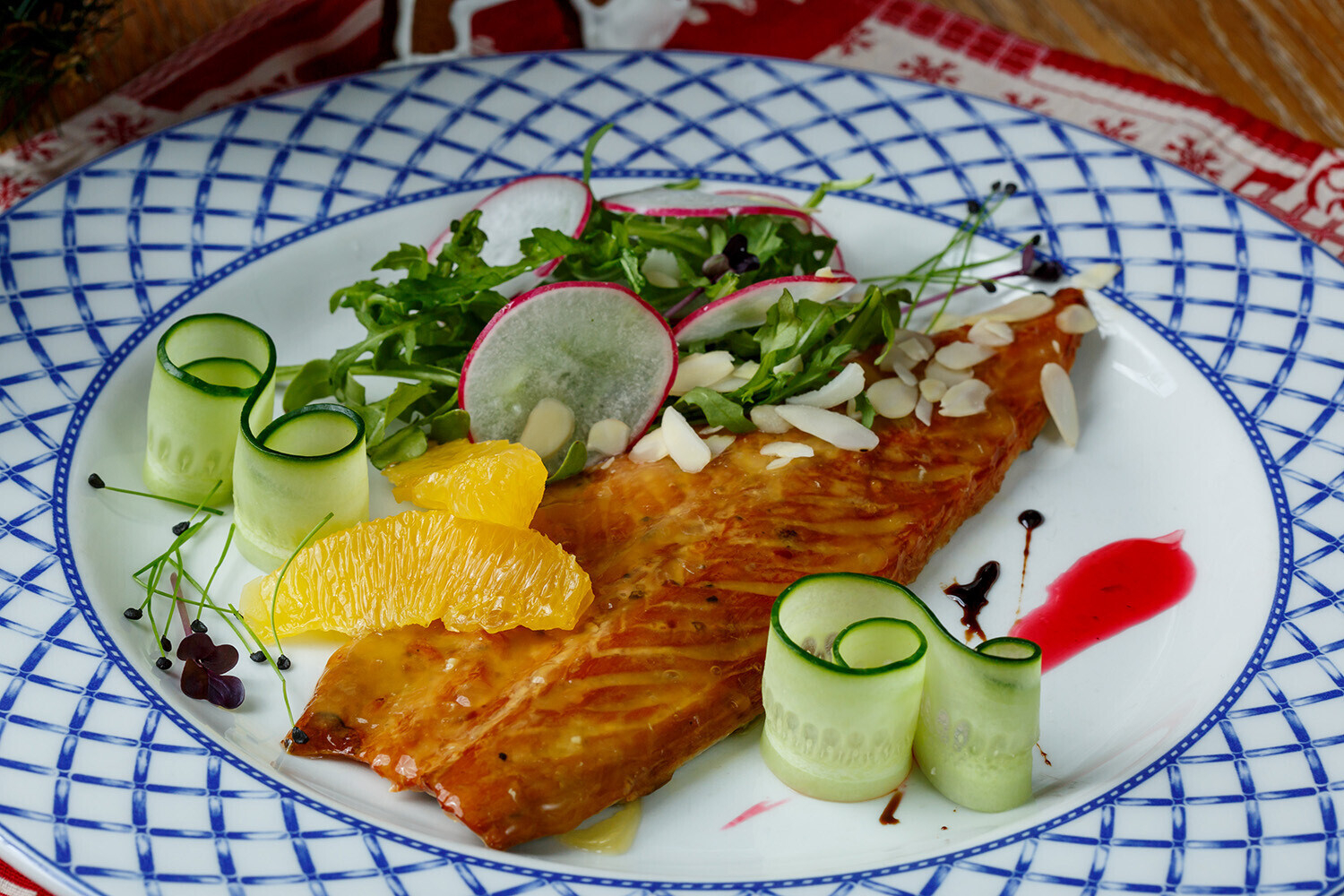 копченым филе макрели в цитрусовой глазури со свежим огурцом и лепестками миндаля