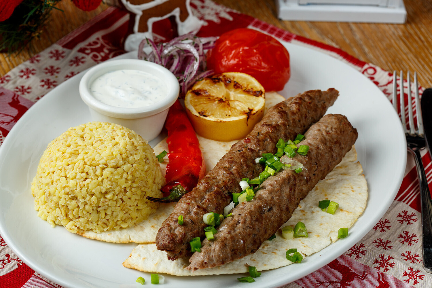 Адана Кебаб с йогуртным соусом, булгуром и овощами, жаренными на гриле