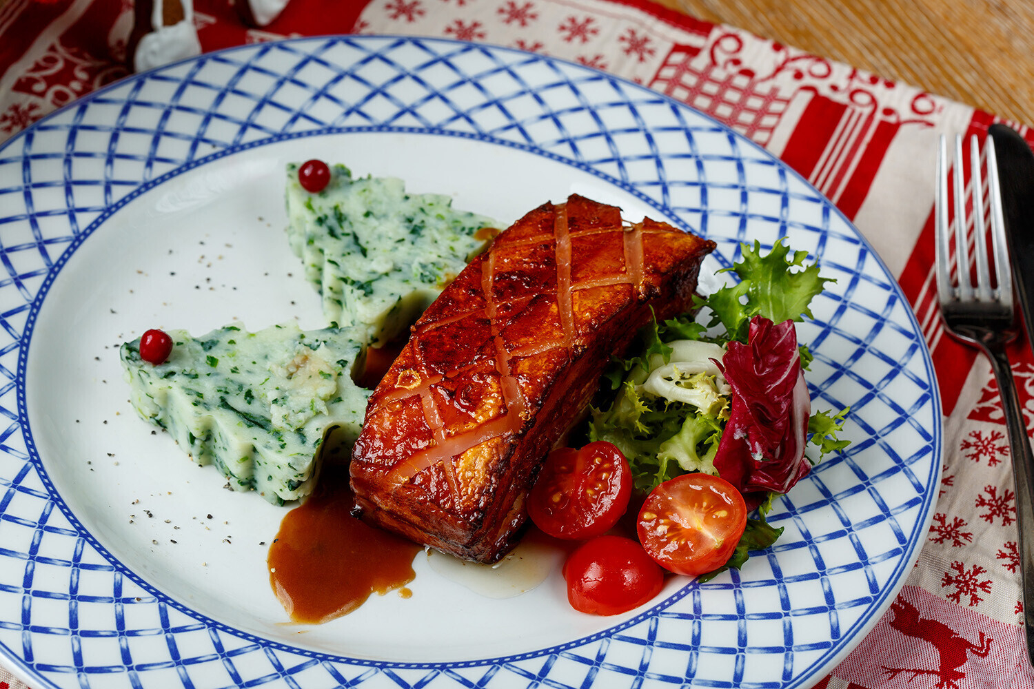 запеченным свиным боком домашнего копчения с картофельным пюре