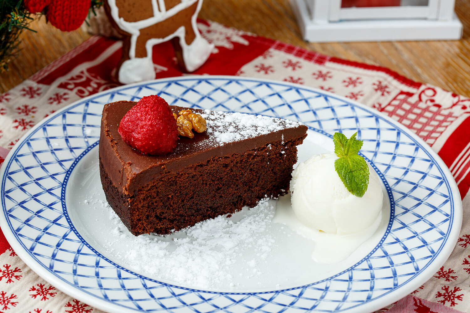 шоколадным брауни с грецким орехом и шариком ванильного мороженого