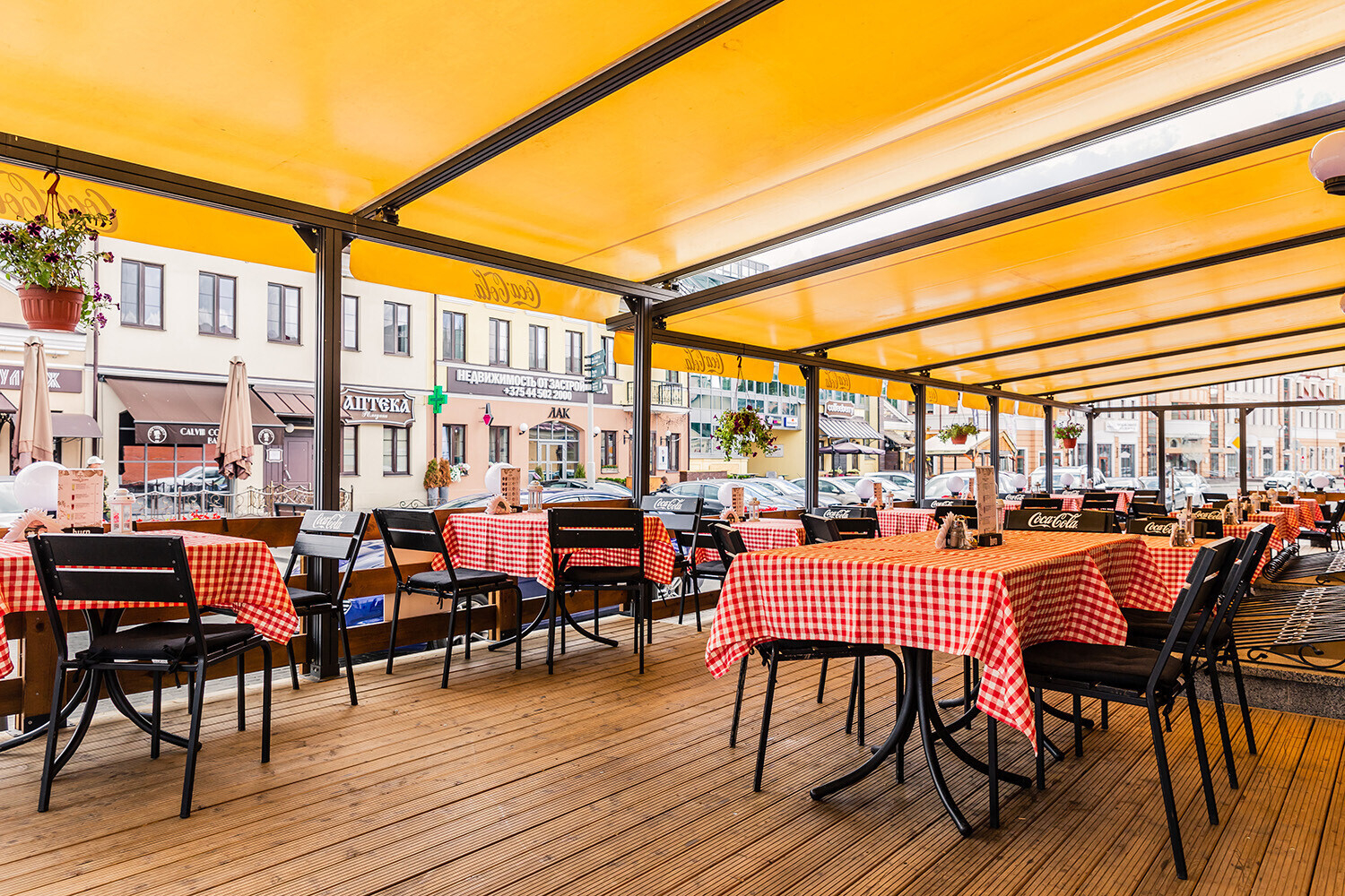 С уютной крытой террасы открывается замечательный вид на площадь Победы — одну из главных достопримечательностей Минска. Находясь здесь, вы в полной мере почувствуете, как бурлит жизнь