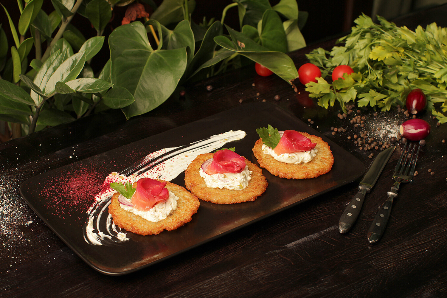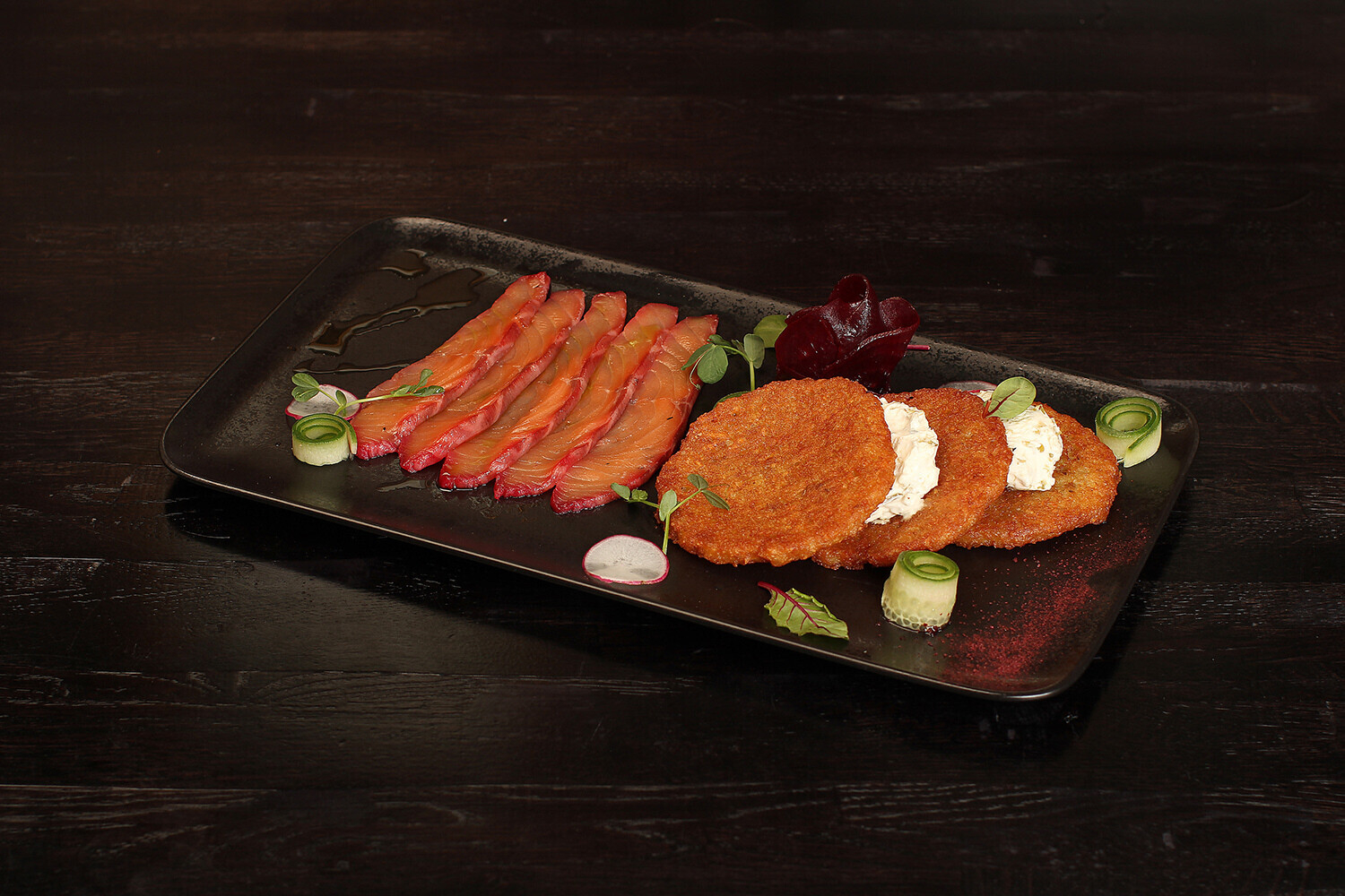 Состав: картофельные оладьи, маринованный лосось собственного производства, сырный крем, свежий огурец, маринованная свекла, редис, зеленый лук.