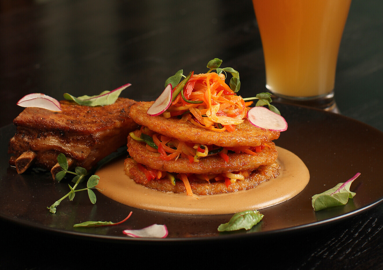 Состав: картофельные оладьи, сочные ребра sous-vide, перец сладкий, морковь, цуккини, лук, соус Порту, горошек, редис.
