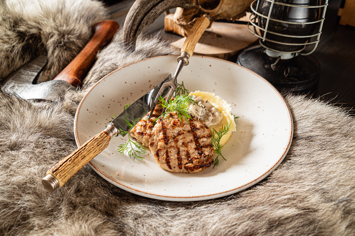 Рубленые котлеты из кролика, обжаренные на гриле в комбинации с картофелем и грибным соусом.