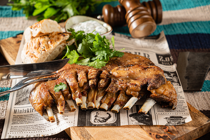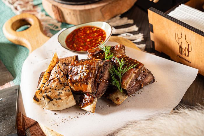 Рёбра молодого барашка с мятно-йогуртным соусом и воздушной лепешкой.