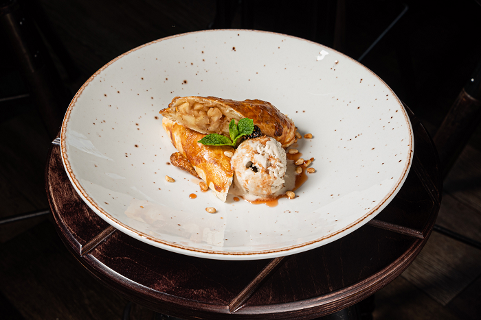 Штрудель с печеными яблоками и корицей в аккомпанементе с мороженым из белых грибов и вареньем из сосновых шишек.