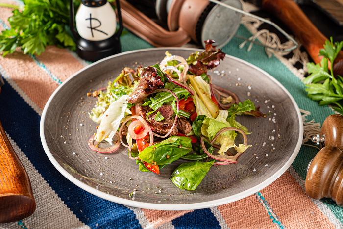 Свежие листья салата с обжаренным на гриле ростбифом, хрустящими маринованными огурцами и сладким перцем.