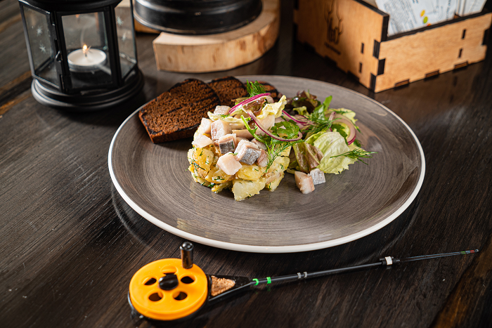 Крупнорубленое филе сельди с обжаренным картофелем, укропом, ржаным хлебом и свежим салатом.