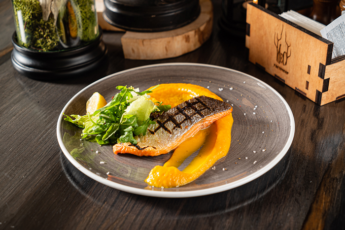 Дальневосточная нерка, обжаренная на гриле, с нежным тыквенным пюре.