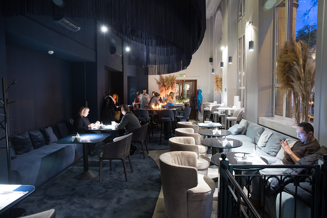 Идея городского кафе предполагает встречи с друзьями и близкими за чашечкой горячего кофе, бокалом вина, вкусным десертом или изысканным блюдом. Столики в центре зала подходят для этого как нельзя лучше, особенно в вечернее время, когда зажигаются свечи и атмосфера в кафе становится невероятно камерной и уютной. А для любителей романтики здесь организовали отдельную зону под дизайнерской кисеей.