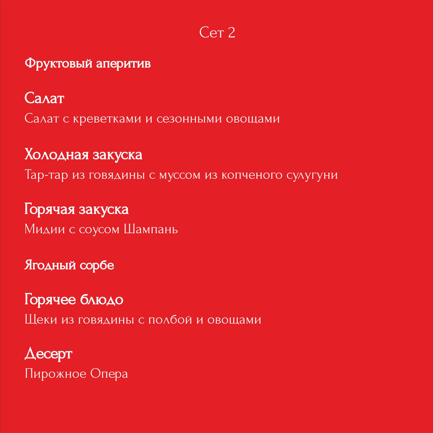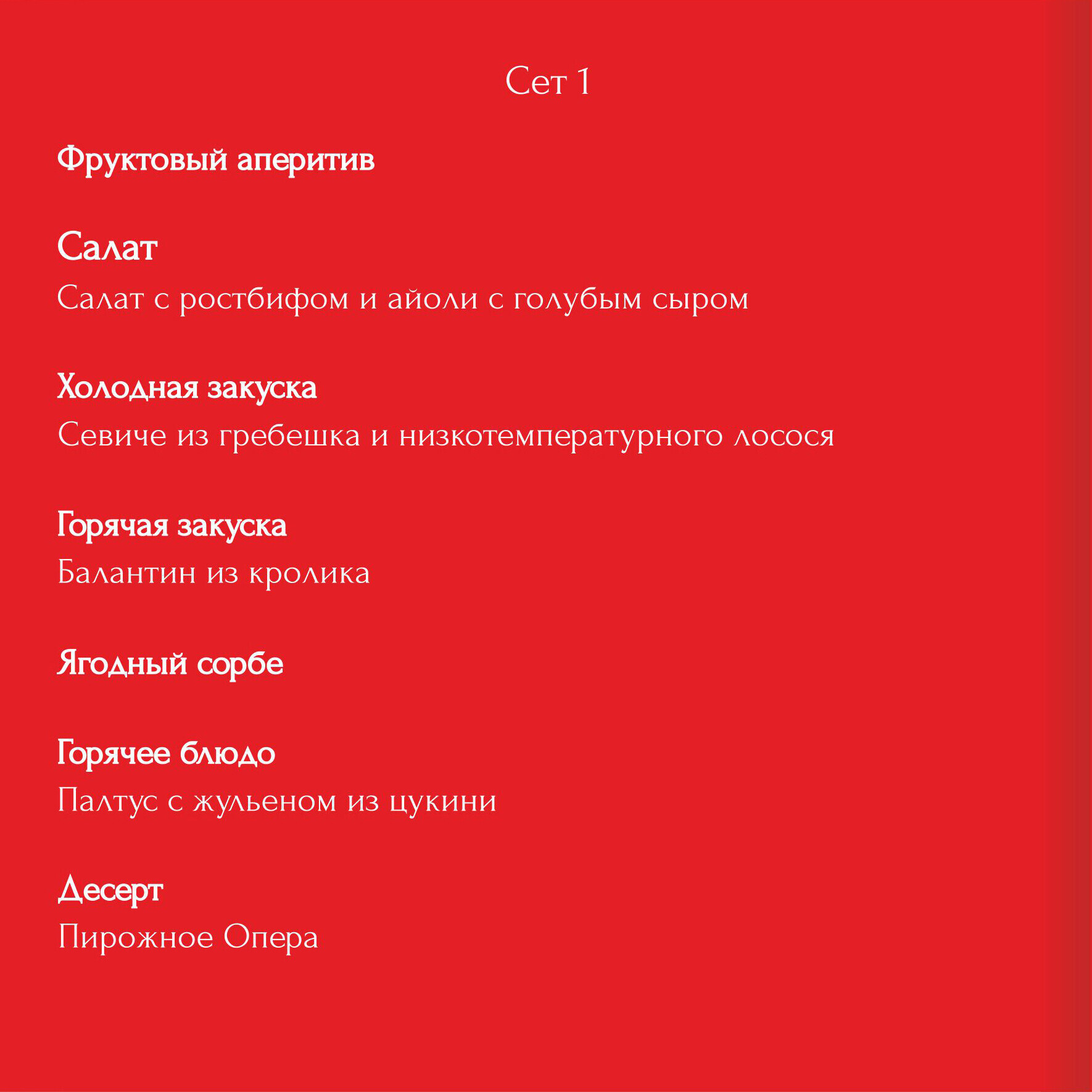 Представляем вниманию гостей специальное меню от шеф-повара Максима Щетко для новогодней вечеринки. 2 изысканных сета на выбор и гармонично подобранная карта вин не оставит равнодушным никого.