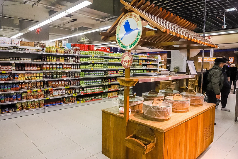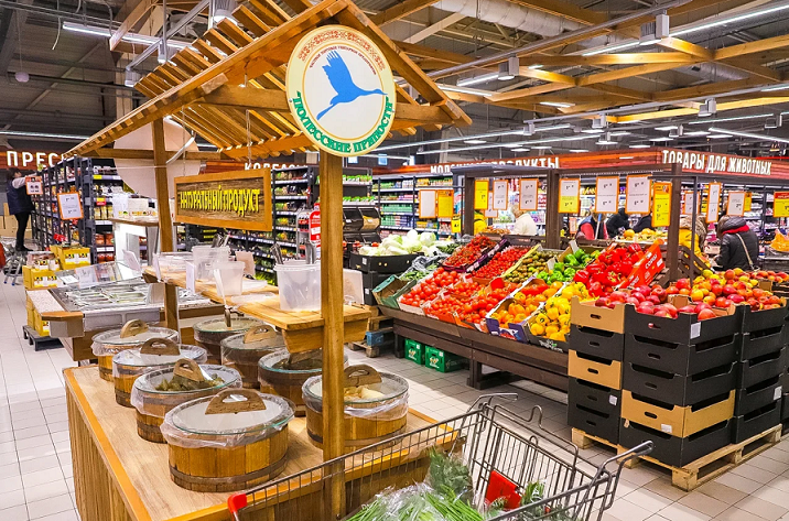 Супермаркеты имеют схожие площади — свыше 1500 кв.м. В каждом собрали около 18 000 наименований товаров. Позаботились также о расширении выбора в молочной витрине и мясном отделе с собственной нарезкой, колбасами и полуфабрикатами. В центре — большой остров с фруктами и овощами, солениями и салатами.