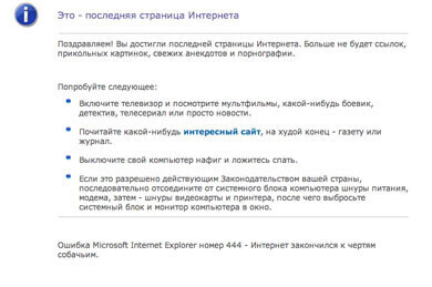Почти в каждом коллективе, есть человек, у которого вечно проблемы с компьютером. Можно сказать, что это «любимчики» системных администраторов, которые просят помощь последних буквально каждый день. Что вам необходимо сделать? Прийти заранее на работу, включить ее компьютер и в браузере установить новую домашнюю страницу http://www.holmogorov.ru/last.html . Когда, ваша «жертва» решит воспользоваться благами интернета, она столкнется с проблемой того, что уже находится на последней странице интернета. Словом, дальше искать уже некуда.