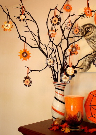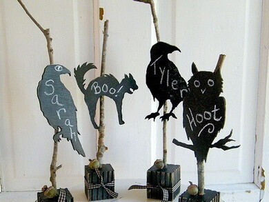 Самым доступным и простым способом является украшение стен фигурками из цветной бумаги и картона. Вам понадобится шаблон летучей мыши, привидения или тыквы, цветная бумага, ножницы и двусторонний скотч. Основную выкройку можно распечатать на принтере или нарисовать от руки, вырезать по контуру и сделать множество копий. Чем больше фигурок будет, тем эффектнее будет результат. Также из плотного черного картона можно вырезать подставки для чашек и тарелок в форме паутины, а белым фломастером прорисовать контуры.