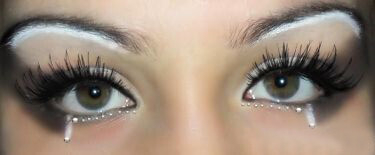 6. И в конце макияжа глаз на Хэллоуин можно использовать накладные ресницы и стразы. Ресницы рекомендуем клеить исключительно на черный клей. Приклеиваем только верхние накладные ресницы и приступаем к стразам. Их расположение зависит от игры вашей фантазии. Может получиться, к примеру, такой результат: