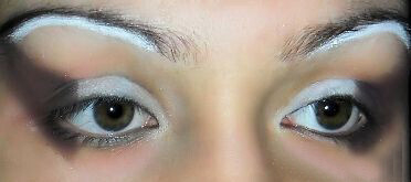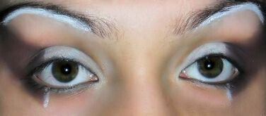 4. У вас должно получиться все точно так, как вы видите на фото. Белые полосы, нарисованные под бровями, визуально сократят расстояние от подвижных век до окончания неподвижных.