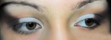 2. Затем берём белые тени и основательно припудриваем ими верхние подвижные веки. Следом наносим коричневые тени, четко разделяя линию на верхнем веке:
