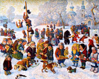 Кстати, вот вам еще один деревенский обряд сжигания чучела масленицы, который происходил в воскресенье - в последний день праздника (к сожалению этот ритуал праздника почти утрачен). "Сударыню-Масленицу" взгромождали на сани, рядом ставили красивую девушку, а в сани впрягались трое молодых людей, которые везли Масленицу по зимним улицам. За санями шествовал масленичный "поезд": целая вереница саней, сопровождавших Масленицу.
