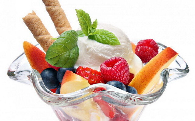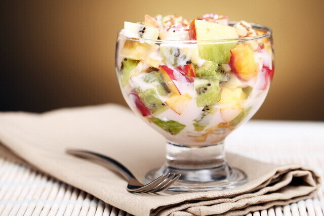Для начала убираем сердцевину из яблока. Учтите, что кожуру очищать не нужно. Яблоко нарезается кубиками небольшого размера. Сразу же поливаем на нарезанное яблоко немного лимонного сока. Если этого не сделать, оно потемнеет. Что касается остальных фруктов, то они также нарезаются кубиками. Все фрукты заливаются йогуртом. Особое внимание обратите на подачу. Такой салатик лучше всего подавать в небольших прозрачных вазах или же креманках. Если же таковых нет, просто используйте маленькие стаканы или бокалы. Перед подачей охладите салат в холодильнике и украсьте листочком мяты.